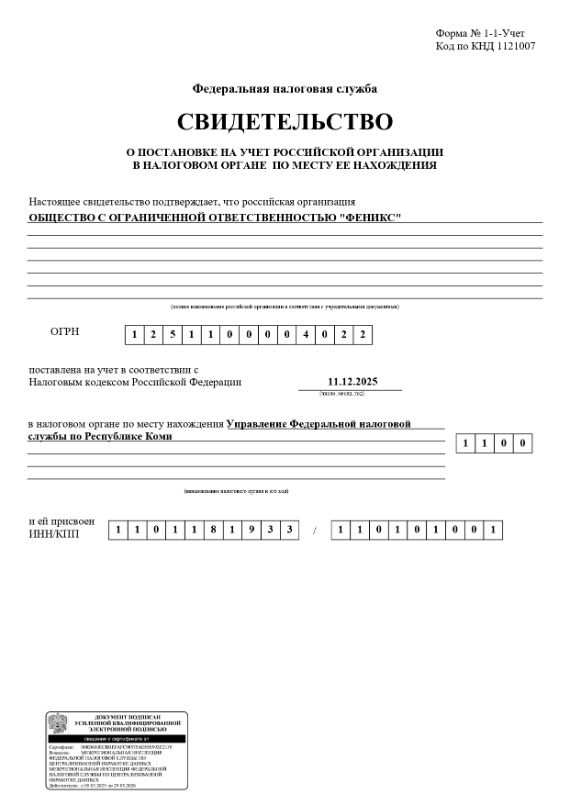 Организация ОБЩЕСТВО С ОГРАНИЧЕННОЙ ОТВЕТСТВЕННОСТЬЮ "ФЕНИКС" зарегистрирована в едином государственном реестре юридических лиц 11 декабря 2025 года.
